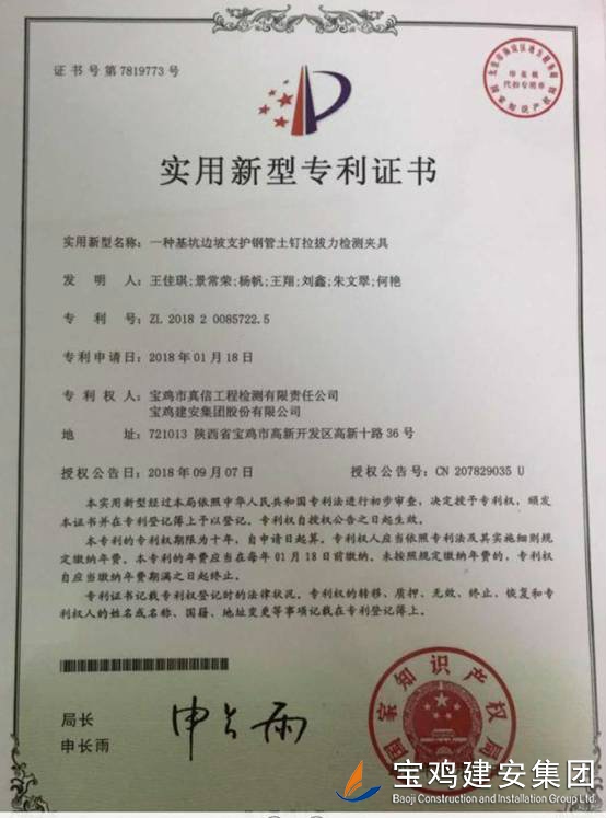 近日,由真信公司“楊帆創(chuàng)新工作室”自主研發(fā)的《一種基坑邊坡支護鋼管土釘拉拔力檢測夾具》獲得國家知識產(chǎn)權局批準,正式頒發(fā)實用新型專用證書!(專利號:ZL 2018 2 0085722.5) 這是我們真信公司建司18年來,也是我們單位建室48年來,第一個國家級發(fā)明專利,具有里程碑的意義!真信公司長期以來以“打造學習、創(chuàng)新型的團隊”為目標,在日常的工程檢測工作中,不斷去探索、發(fā)現(xiàn)問題,及時的優(yōu)化,創(chuàng)新。 2017年9月,在公司的批準及大力支持下,以楊帆同志命名的“楊帆創(chuàng)新工作室”正式成立了!工作室以“科學、嚴謹”為宗旨,以“解決日常檢測工作中遇到的頑疾,提高檢測工作效率及準確性”為目標,正式投入到實用新型產(chǎn)品的研發(fā)之中。 土釘墻在工程中較多見,其主要是用于工程前期邊坡支護的工程,以防邊坡失穩(wěn)造成的邊坡塌方對人員生命財產(chǎn)安全及工程進度造成損失。目前市場上檢測土釘?shù)睦蝺x和配套的夾具絕大部分是針對鋼筋土釘拉拔力設計的,而未涉及到鋼管土釘拉拔力專用夾具,從而未能對其進行檢測,以至于不能有效的將檢測數(shù)據(jù)反饋給建設單位及設計單位來進行指導施工和結果評判。這個問題長期以來困擾著廣大檢測工作者,給檢測工作及工程施工造成了諸多不良影響,創(chuàng)新,勢在必行! 作為工作室的首個研發(fā)項目,成員們克服日常工作任務繁重的困難,多次深入施工現(xiàn)場,親身體會,不斷地去嘗試,思索。在模具的制作過程中,為了讓產(chǎn)品更好的發(fā)揮出“實用型”的效果,工作室負責人楊帆同志多次前往加工車間,與技術人員緊密溝通,多次親自上手?;氐絾挝唬ぷ鹘M即刻展開交流學習,在電腦上反復的推敲、勾畫…… (寶雞真信工程檢測有限責任公司 秦建偉)