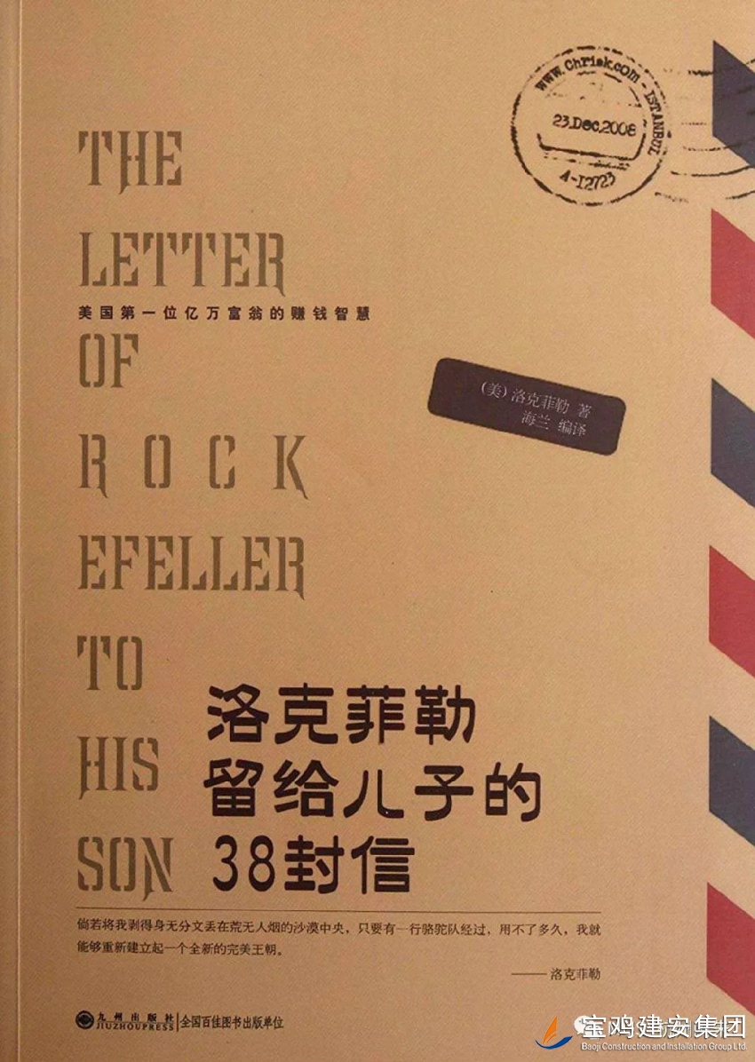 單位:第八項(xiàng)目部 作者:張兆陽 中國有句古話:至樂莫若讀書,至要莫若教子。如何教育引導(dǎo)好年輕人,長(zhǎng)久以來都是世界各個(gè)階級(jí)父母所關(guān)注的話題。洛克菲勒,標(biāo)準(zhǔn)石油公司創(chuàng)立者、全球首富。2009年福布斯公布“美國史上十五大富豪”,洛克菲勒名列榜首。這樣一個(gè)商業(yè)巨擘,同樣也在研究如何指引年輕一代。在這本書中,就淋漓盡致地呈現(xiàn)出了他對(duì)教育的見解。