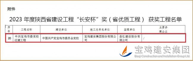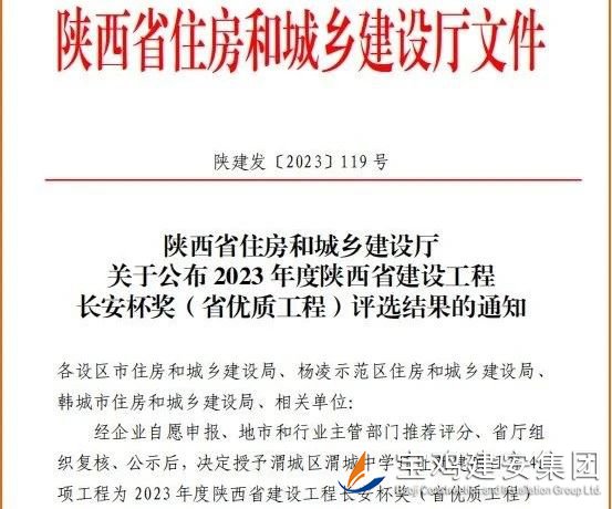 近日,陜西省住房和城鄉(xiāng)建設廳《關于公布2023年度陜西省建設工程長安杯獎(省優(yōu)質(zhì)工程)評選結果的通知》正式下發(fā),公司承建的中共寶雞市委黨校遷建工程榮登金榜,為集團再添一項陜西省建設工程“長安杯”獎。